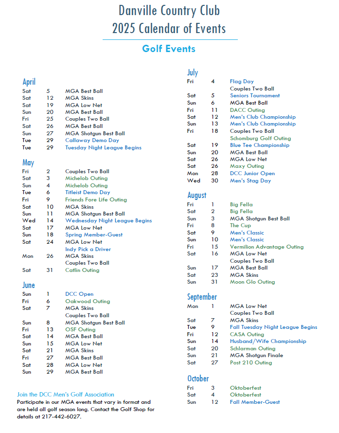 Check out our golf and social events for the whole year! Everything from small golf events to large outings, to themed dinner nights and large parties. There’s something for everyone at DCC. Many of these events are member-guest events, so be sure to keep an eye out for the next upcoming event.